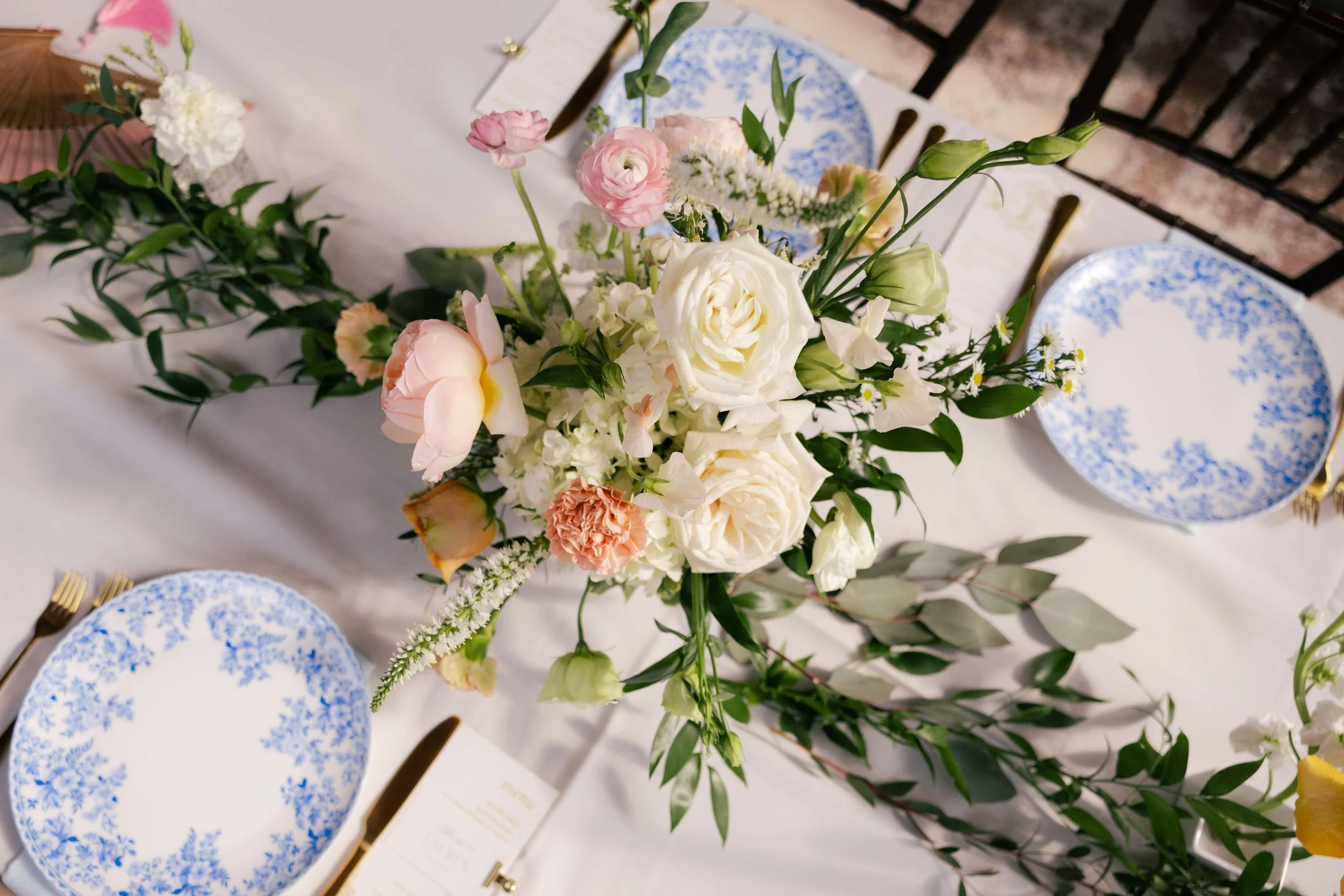 Anna's bridal bouquet was nothing short of breathtaking. A lush, statement-making arrangement featuring garden roses, ranunculus, and trailing amaranthus brought together the day's color palette of pinks, peach, ivory, and yellow in the most stunning way.